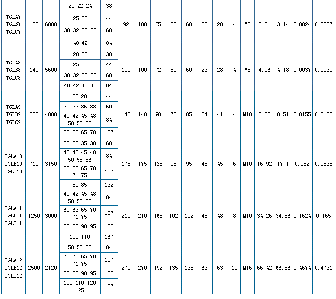 | 注:1、瞬時(shí)過載轉(zhuǎn)矩不得大于公稱轉(zhuǎn)矩的2倍。 2、質(zhì)量和轉(zhuǎn)動(dòng)慣量是各型號(hào)中*大值的近似計(jì)算值。 3、B1是保證原動(dòng)機(jī)或工作機(jī)安裝所必需的*小尺寸。 4、推薦TGL10~TGL12采用B型。 TGL聯(lián)軸器許用補(bǔ)償量 |
