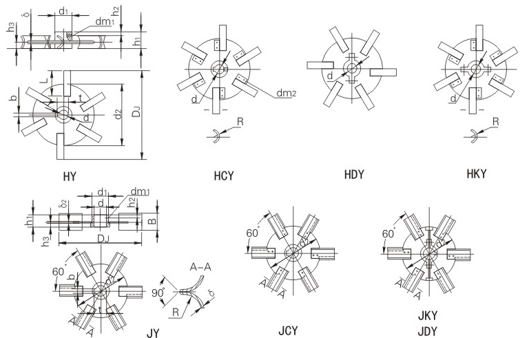 半圓弧圓盤渦輪式-HY、半圓弧可拆圓盤渦輪式-HCY、半圓弧對開圓盤渦輪式-HDY、半圓弧可拆對開圓盤渦輪式-HKY、箭葉圓盤渦輪式-JY、箭葉可拆圓盤渦輪式-JCY、箭葉對開圓盤渦輪式-JDY、箭葉可拆對開渦輪式-JKY