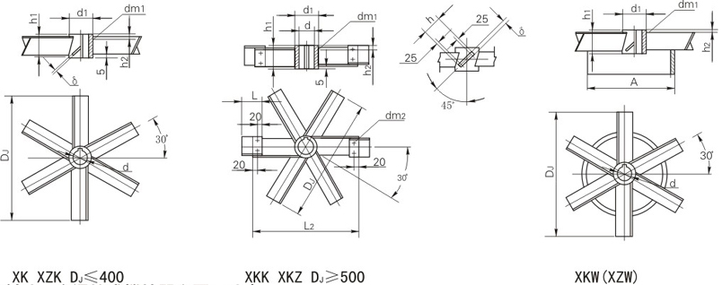 六斜葉整體開啟渦輪式XK、六斜葉可拆開啟渦輪式XKK、六斜葉穩(wěn)定環(huán)開啟渦輪式XKW、六斜窄葉整體開啟渦輪式XZK、六斜窄葉可拆開啟渦輪式XKZ、六斜窄葉穩(wěn)定開啟渦輪式XZW