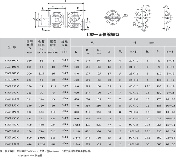 SWC型、SWP型十字軸式萬向聯(lián)軸器的主要特點為:1.具有較大的角度補償能力。2.結(jié)構(gòu)緊湊合理。SWC型采用整體式叉頭,使運載更具可靠性。3.承載能力大。與回轉(zhuǎn)直徑相同的其它型式的聯(lián)軸相比較,其所傳遞的扭矩更大,此對回轉(zhuǎn)直徑受限制的機械設(shè)備,其配套范圍更具優(yōu)越性。4.傳動效率高。其傳動效率達98-99.8%,用于大功率傳動,節(jié)能效果明顯。5.運載平穩(wěn),噪聲低,裝拆維護方便。